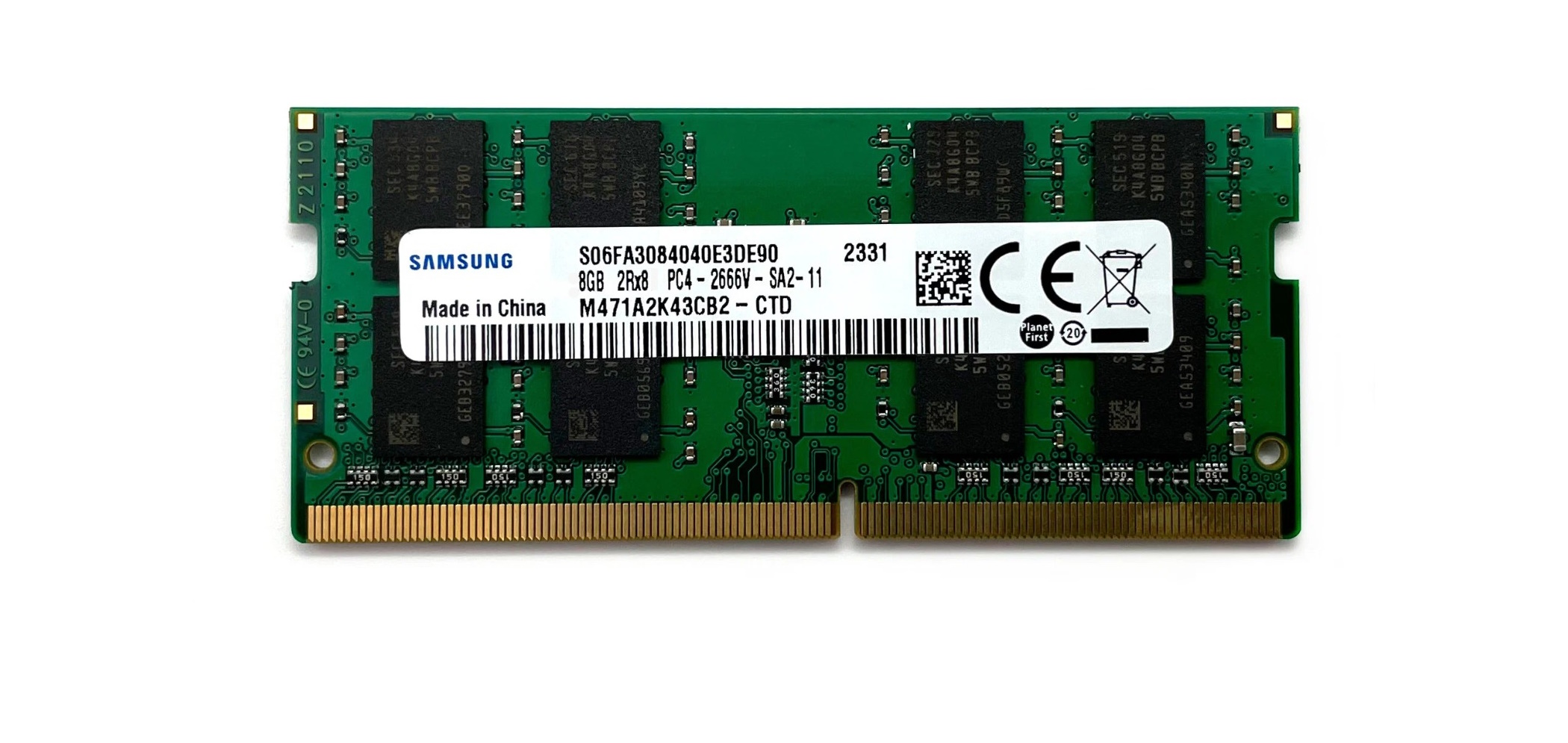 Оперативная память SODIMM Samsung [M471A1K43CB1-CTD] обладает высоким уровнем производительности. Тактовая частота устройства – 2666 МГц. Пропускная способность памяти – 21300 МБ/с. Тайминги модуля – 19-19-19. Напряжение питания – 1.2 В. Это стандартный показатель для DDR4. Конструкцией памяти предусмотрены 8 чипов, расположенные с обеих сторон. Цвет текстолита – зеленый.