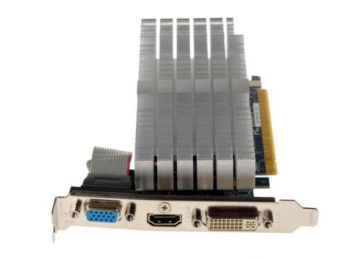 Видеокарта GIGABYTE GeForce GT 610 [GV-N610SL-1GI] – отличное решение для неттопов или HTPC-систем, обладающее одним гигабайтом видеопамяти, процессором GF119 с тактовой частотой 810 МГц и пропускной способностью 9.6 Гбайт/сек. Графический ускоритель подключает посредством PCI Express второго поколения, есть интерфейсы D-SUB, DVI и HDMI-порт, а также поддержка одиннадцатого DirectX и OpenGL 4.3. Система охлаждения – пассивная с алюминиевым радиатором.